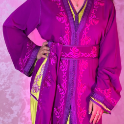 Éclatante et raffinée, cette tenue artisanale se compose d’un haut sans manches à col chemise brodé et d’une jupe fluide assortie, mettant en valeur la silhouette avec élégance. Confectionnée à la main dans un satin lisse au fini brillant, cette création allie modernité et tradition grâce aux broderies marocaines fines qui ornent le col et la ceinture.